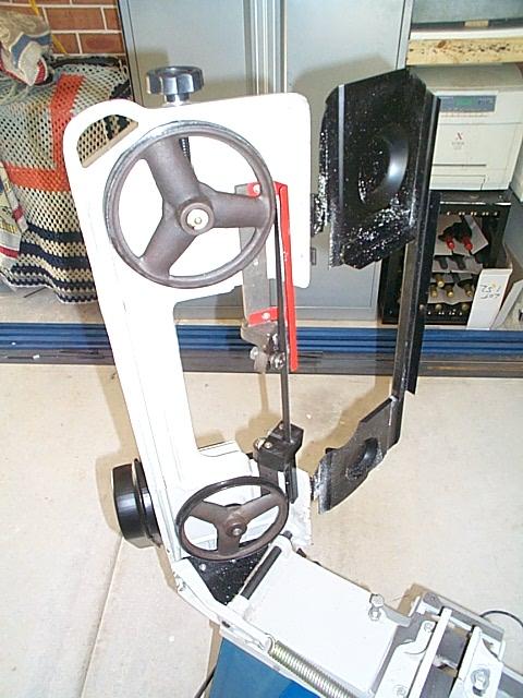 This view from the top shows the blade pretensioner knob. This pulls the top blade pulley in thus tensioning the saw blade. The clamp udjusts to accomodate 45 degree cuts. I use a precision square to ralign the clamp to 0 degrees when finished with 45s |