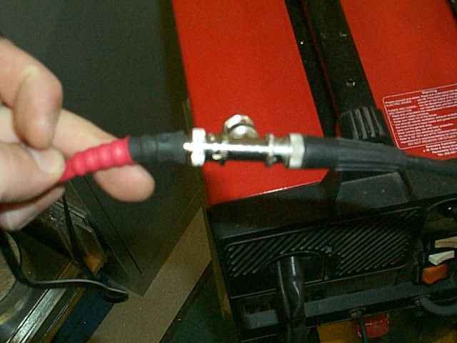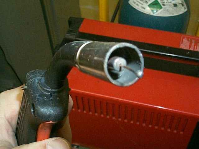 This is the nozzle. The gas comes out of the nozzle and shields the weld. The wire is the electrode. I am still practicing but am getting better. |